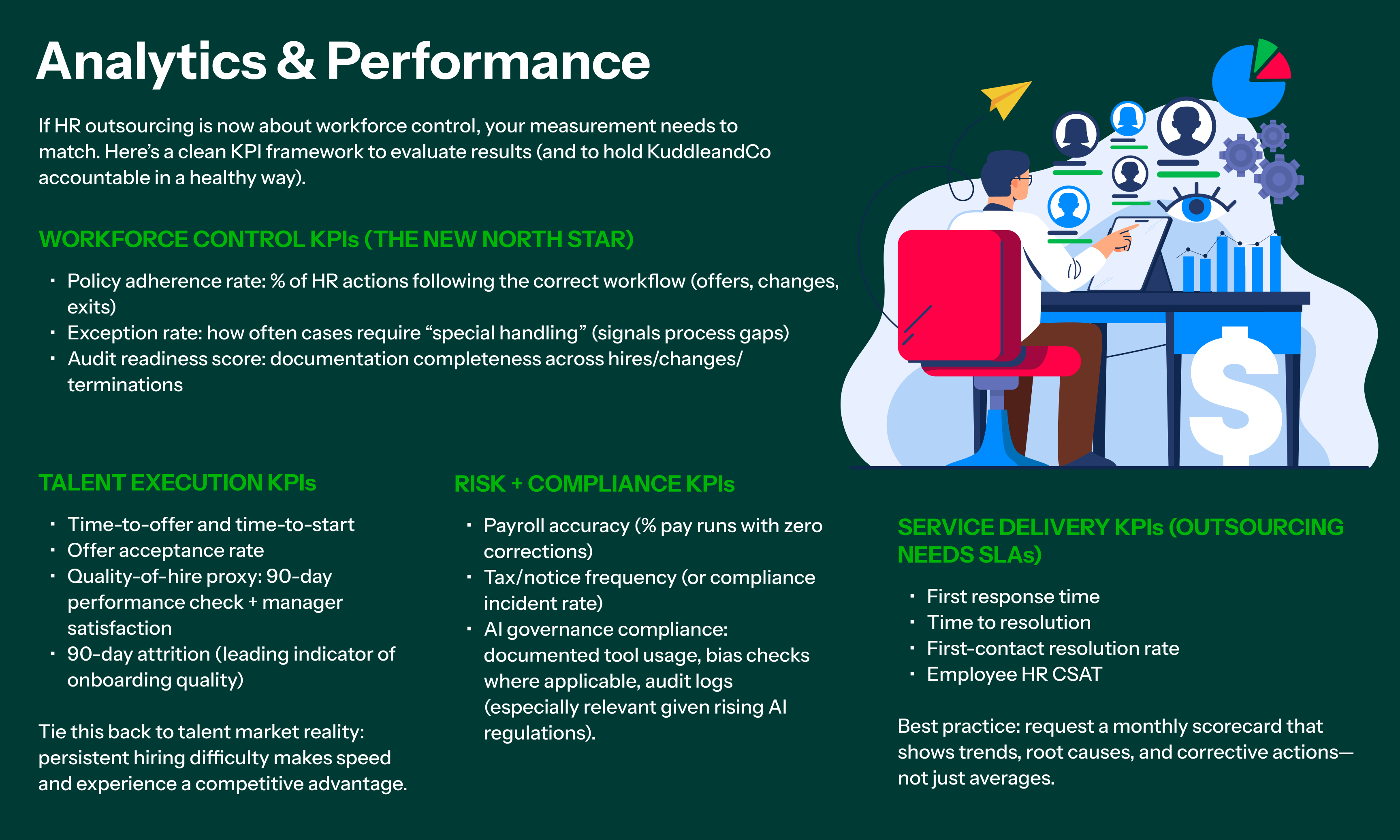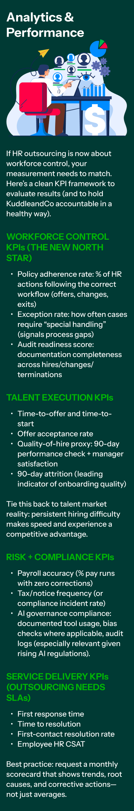 For fast-growth companies, a partner like KuddleandCo should be evaluated not on “what tasks they handle,” but on whether they improve speed, compliance discipline, and measurable talent outcomes—with clear analytics behind it.