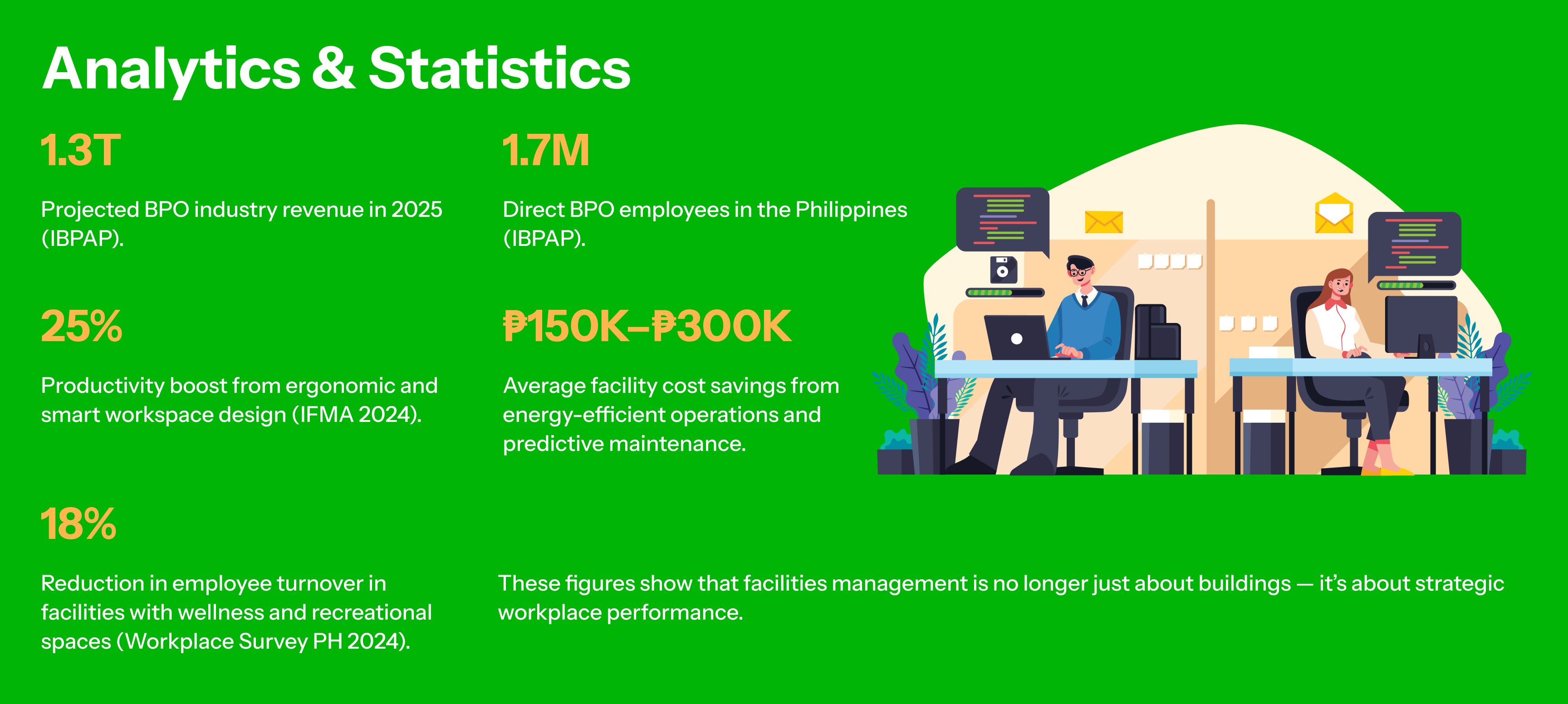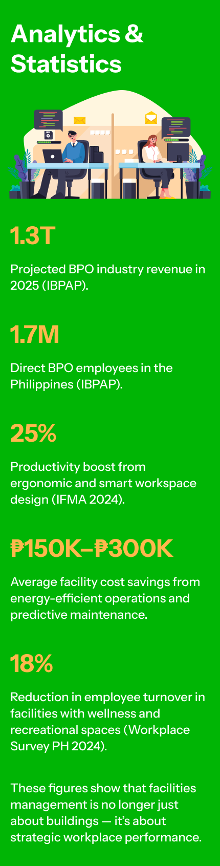 The Business Process Outsourcing (BPO) industry in the Philippines continues to rise as one of the strongest economic drivers, projected to hit ₱1.3 trillion in annual revenue by 2025 (IBPAP Report). As companies expand operations and embrace hybrid work setups, facilities management has become a critical factor in ensuring productivity, employee satisfaction, and operational continuity.