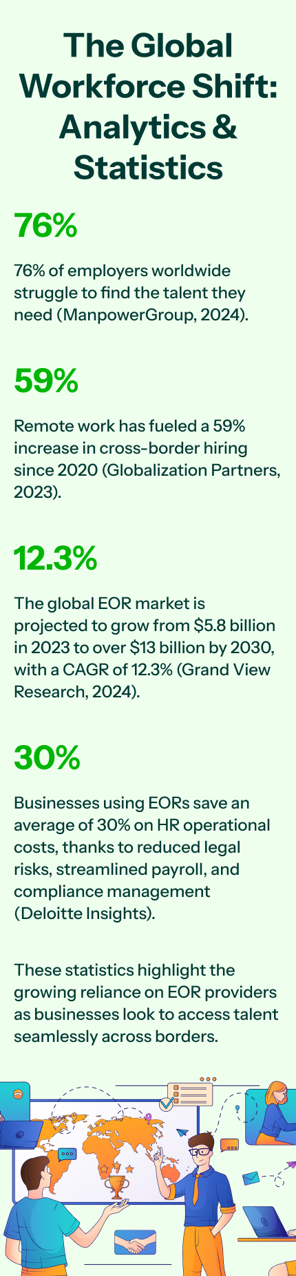 With an EOR, businesses can onboard talent in over 100 countries quickly, bypassing bureaucratic delays and allowing HR teams to focus on strategic initiatives.