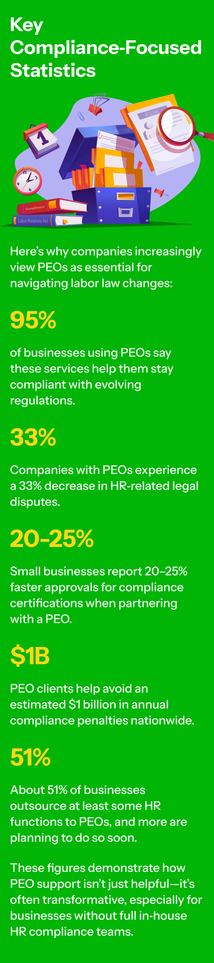 As we move through 2026, labor law complexity is only expected to increase. From new paid leave standards to evolving safety requirements and worker protections, compliance must be dynamic and forward‑looking. Partnering with a PEO provider positions your business to: