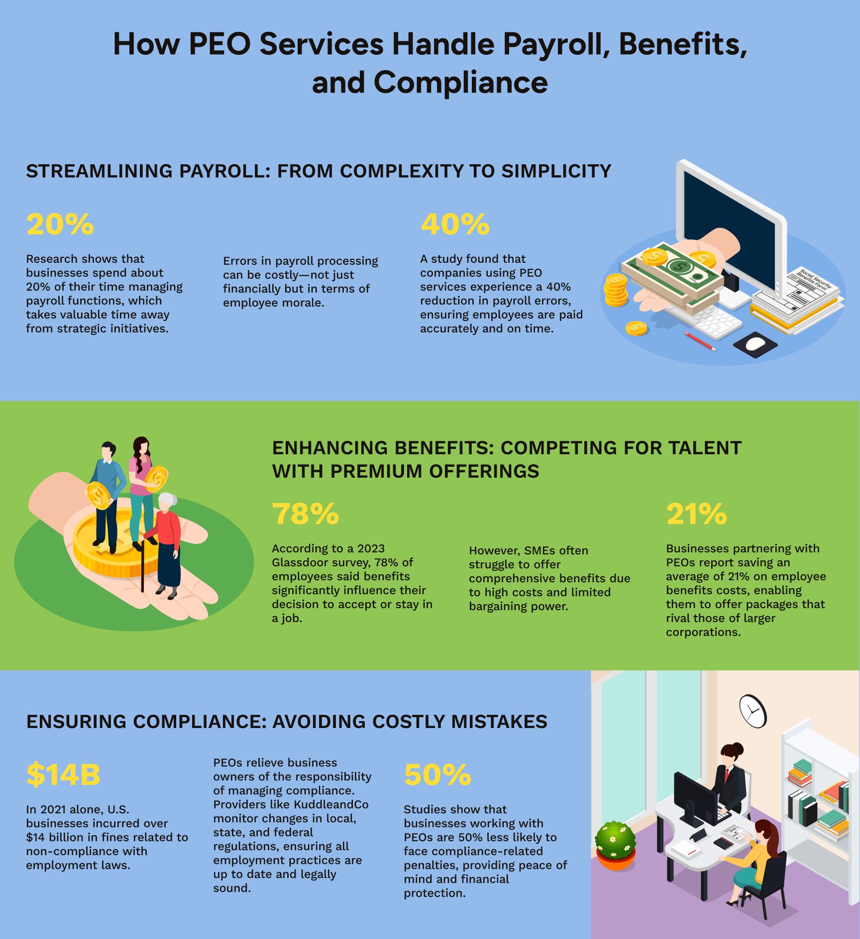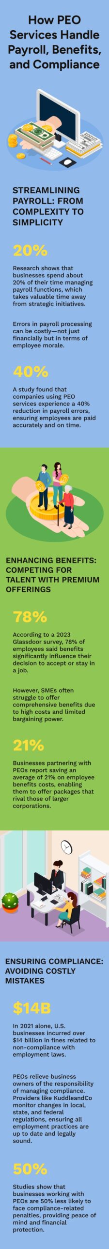 KuddleandCo, a trusted PEO provider, specializes in streamlining these HR processes, ensuring businesses operate efficiently, cost-effectively, and in full compliance with regulations. Here’s how PEO services manage payroll, benefits, and compliance while delivering measurable benefits.