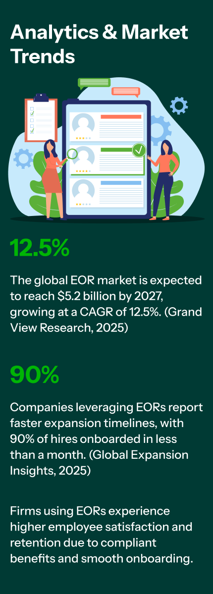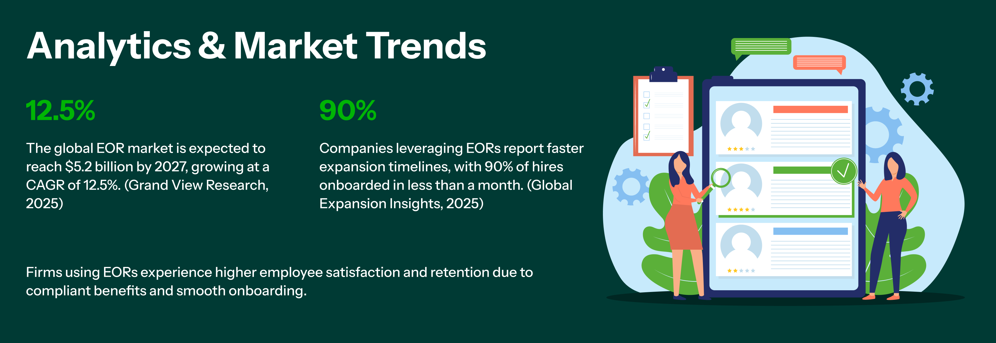 • 62% of organizations cite speed as the primary reason for adopting EOR services. (Global Expansion Insights, 2025)